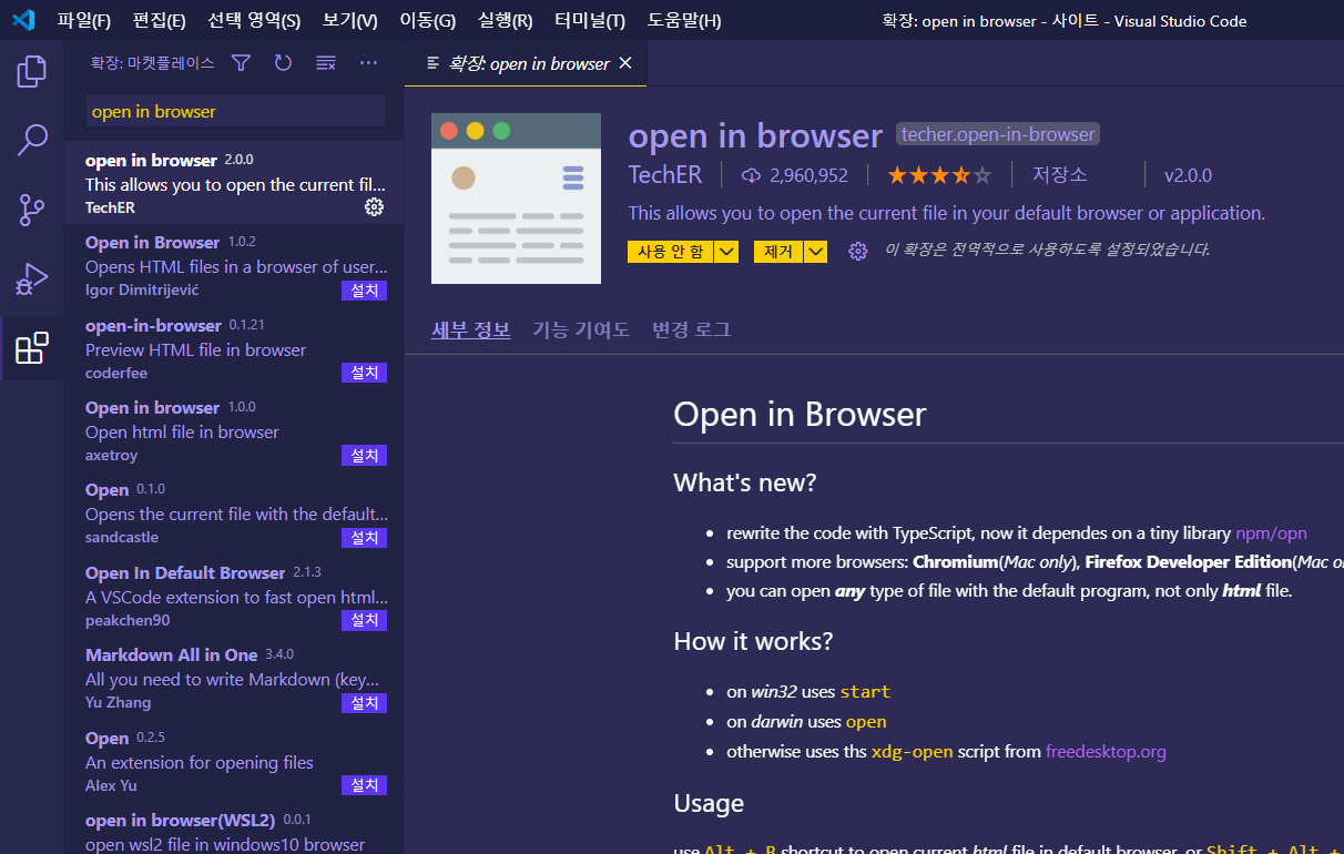 위 단축키를 누르면 검색창이 나오는데 검색창에다가 open in browser를 설치하면 된다.