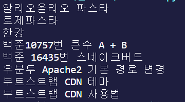 [<strong class="tit_post">알리오올리오 파스타</strong>, <strong class="tit_post">로제파스타</strong>, <strong class="tit_post">한강</strong>, <strong class="tit_post">백준10757번 큰수 A + B</strong>, <strong class="tit_post">백준 16435번 스네이크버드</strong>, <strong class="tit_post">우분투 Apache2 기본 경로 변경</strong>, <strong class="tit_post">부트스트랩 CDN 테마</strong>, <strong class="tit_post">부트스트랩 CDN 사용법</strong>]