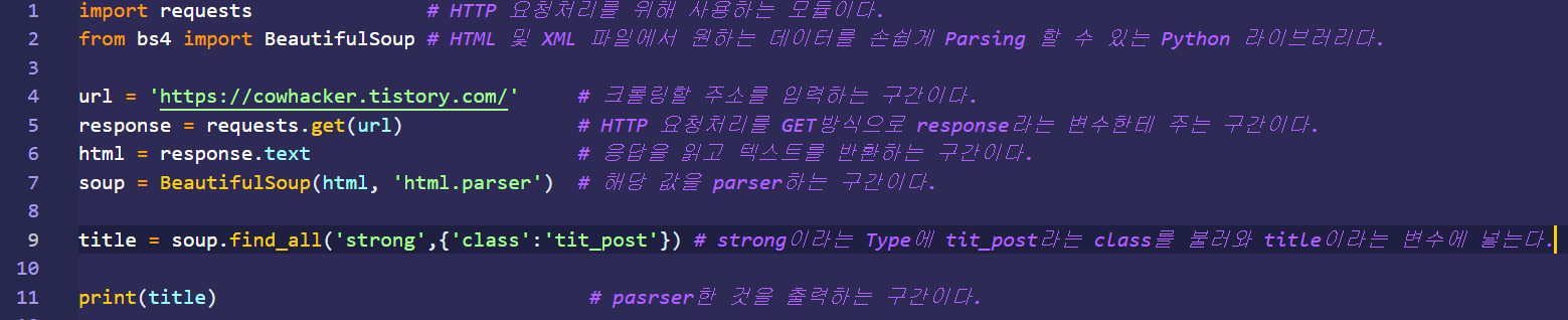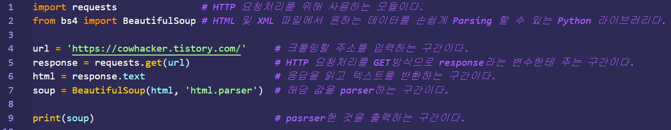 url = 'https://cowhacker.tistory.com/' # 크롤링할 주소를 입력하는 구간이다.