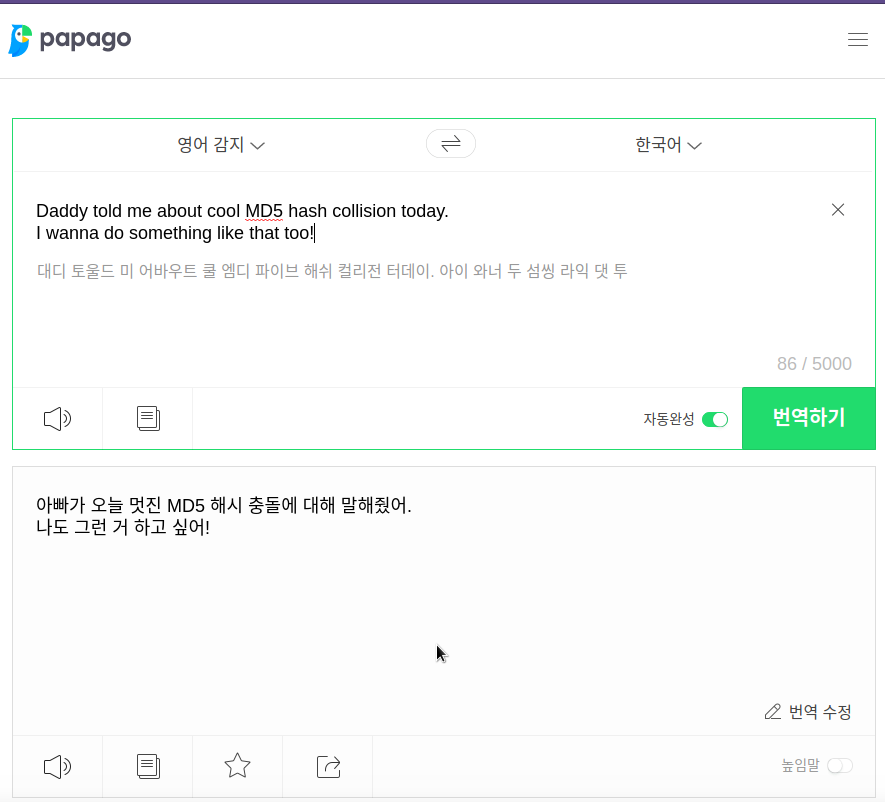해석을 대충 해봤다. 아들이 아빠한테 MD5 충돌에 대해 들었다. 나도 하고싶다??
