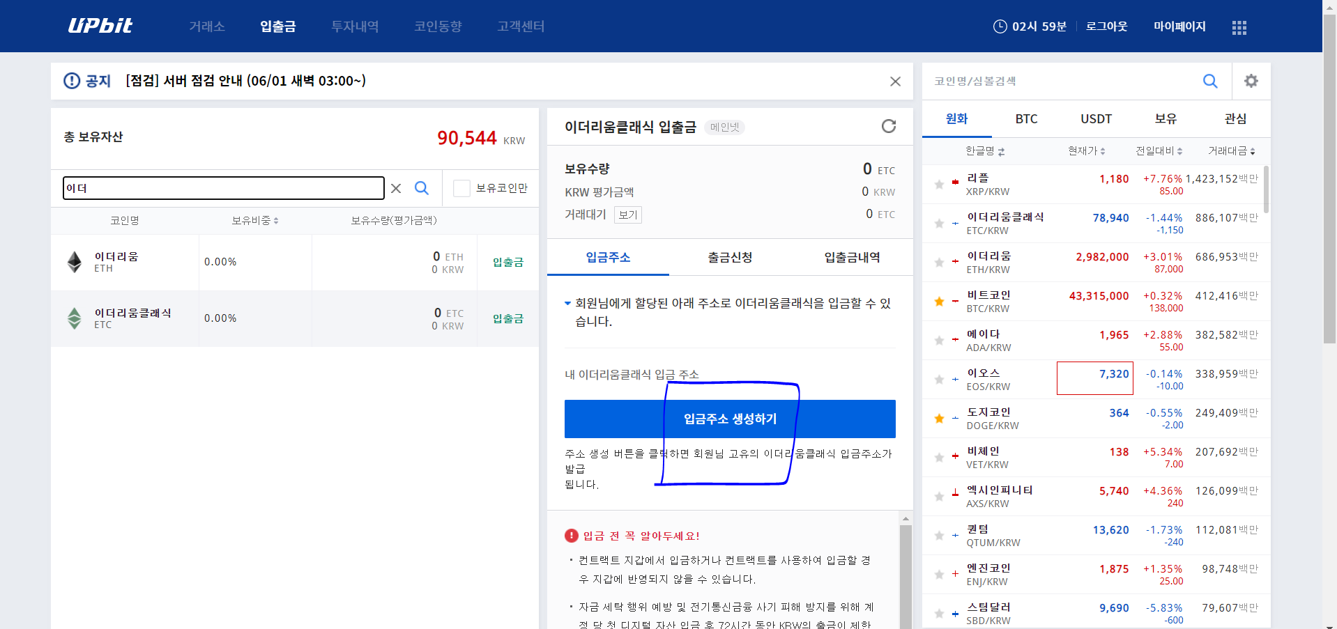 그럼 입금 주소 생성하기라고 버튼이 있는데 클릭한다.