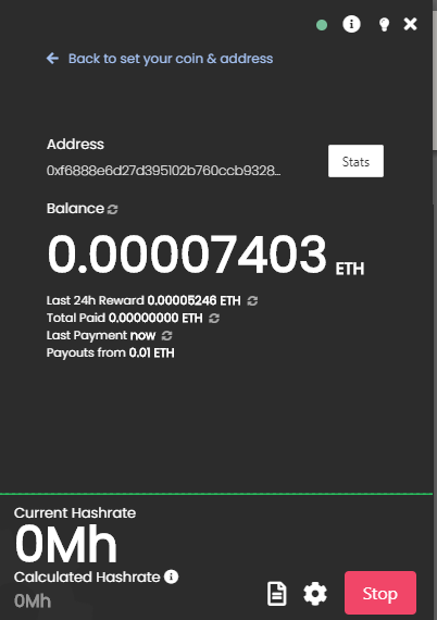 오른쪽 밑에 보면 Stop이라고 버튼이 뜨면 채굴이 되고 있는 것이다.