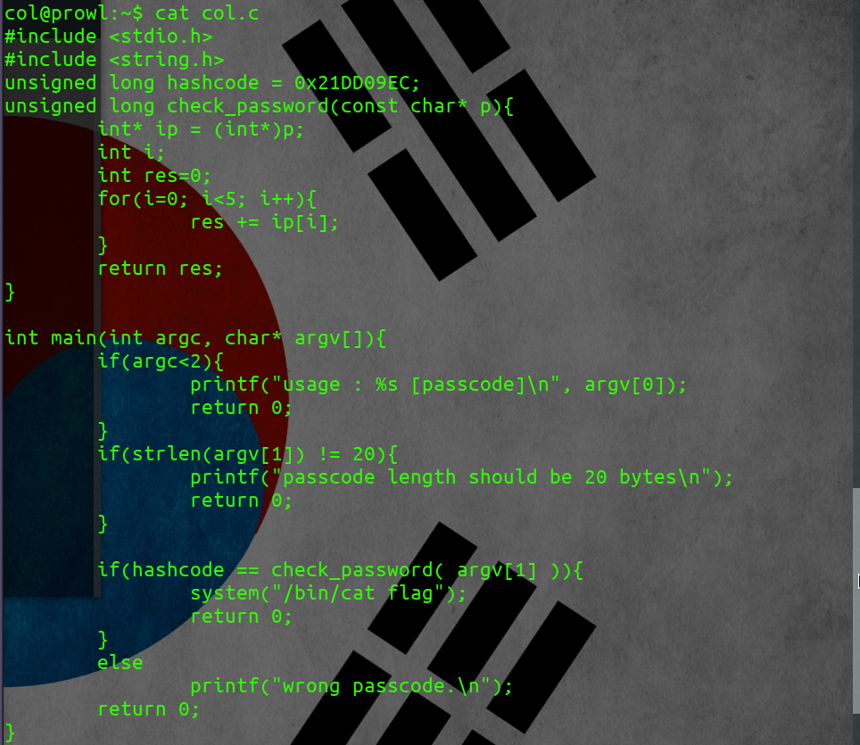 들어간후 일단 뭐가 있는지 ls를 쳐보니 col, col.c flag 가 있었다.