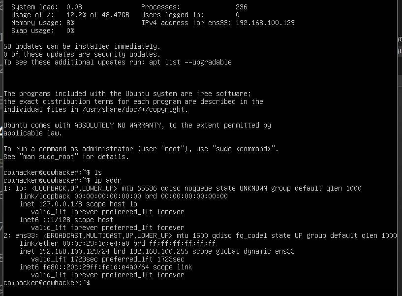 ip addr명령어로 아이피도 확인하고 설치가 완료됨을 확인할 수 있다.