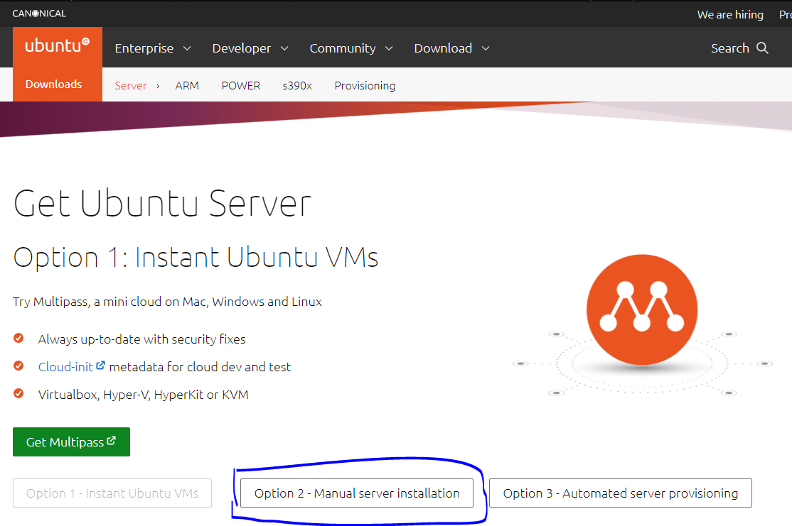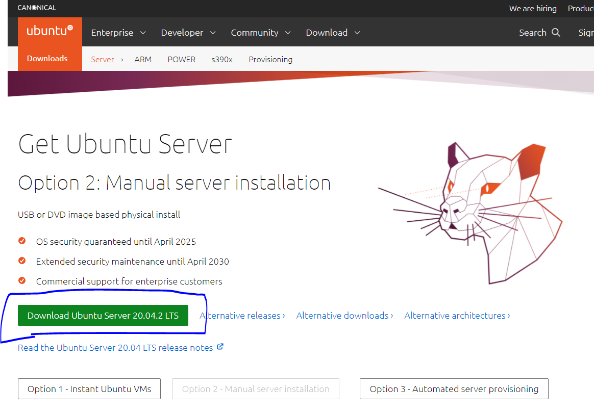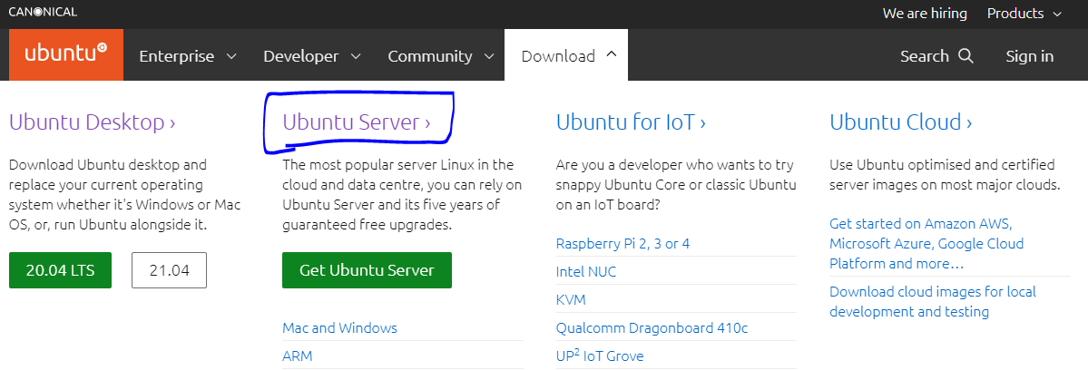 상단에 'Download' 버튼을 눌러보면 추가 탭 창이 뜨는 걸 볼 수 있는데 거기서 'Ubuntu Server'를 클릭한다.