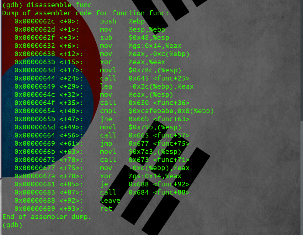 아직은 어셈블리어와 어색한 사이여서 처음부터 끝까지 해석은 못하겠어서 눈에 보이는것만 봤다. +9에 deadbeef라는 부분 이 deadbeef는 아까 c파일에서 func가 반환하는 값이였다. 그래서 바로 밑에 보니 call 하고 func에게로 가는듯 한 모습이 보였다.