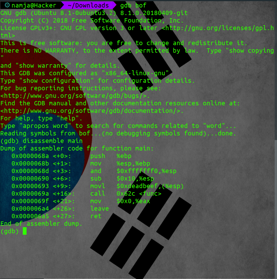 gdb로 연뒤 disassemble main 명령어를 써서 main함수를 어셈블리어로 봤다. 이유는 어떻게 함수가 돌아 가는지 과정 그 자체를 알기 위해서다.