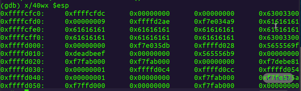일단, a는 아스키코드로 61이다 그 61이 시작하는 부분은 지금 사진을 보면 32 바이트 부터 시작이 된다. 그리고 61 값이 끝난 시점 이후 20바이트후에 deadbeef값이 반환이 되는걸로 보인다.