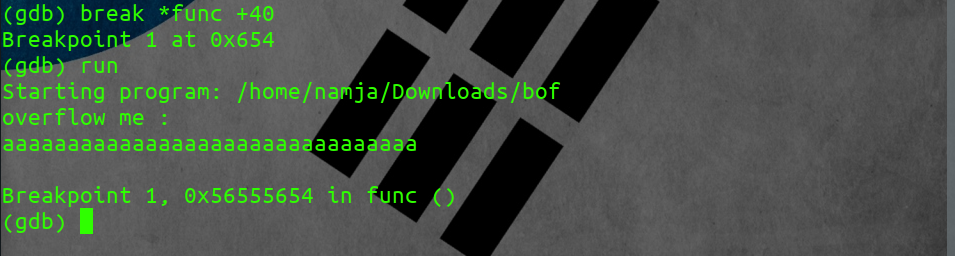 다시 break를 +40에 걸고 run을 해보았다 이제는 가능해졌고 무엇을 입력 하라는 커서가 떳길래 나는 a를 32개 쳐 엔터를 눌렀다.
