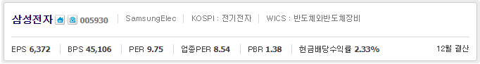 PER은 9.75로 기준 날짜의 삼성전자 주가는 1년간 벌어드린 순수익보다 약 9배 높이 평가되고 있다.