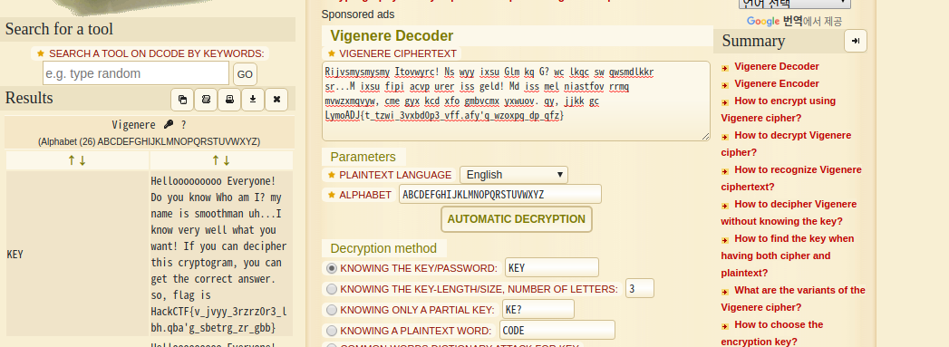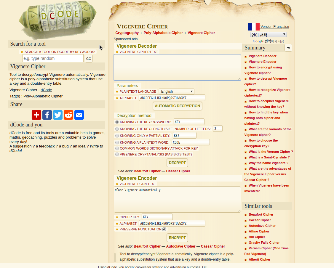 내가 모든 암호 해독 사이트를 구글링 해본 결과 이 문자의 정체는 비즈네르 암호 였다.
