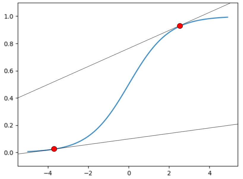시그모이드 함수의 기울기는 어느 장소라도 0이 되지 않는 걸 볼 수 있다.