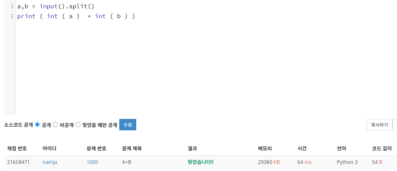 파이썬으로는 split()를 써 한번에 입력 두번을 받게 만들었다.