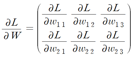 예를 들어 1 행 1 번째 원소는 w11을 조금 변경했을 때 손실 함수 L이 얼마나 변화하느냐를 나타낸다.