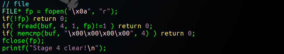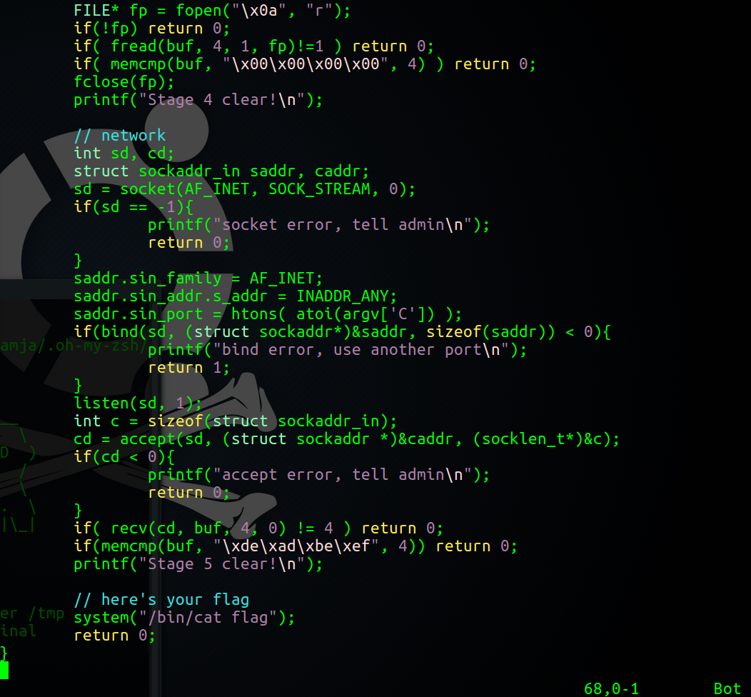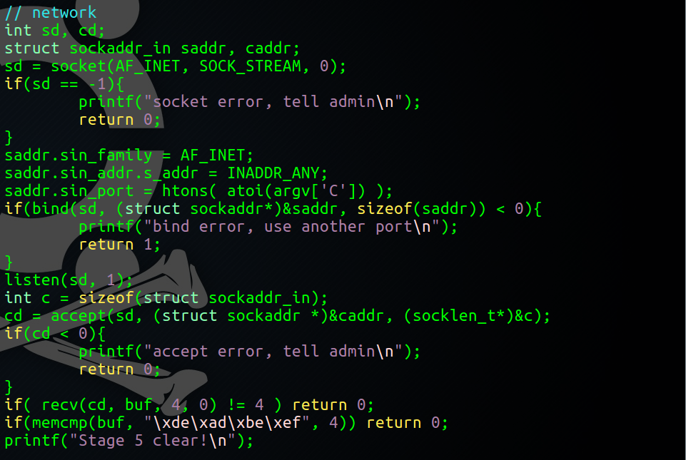 이후에 4바이트 문자열을 입력받아 \xde\xad\xbe\xef 와같으면 stage 5가 클리어 된다.