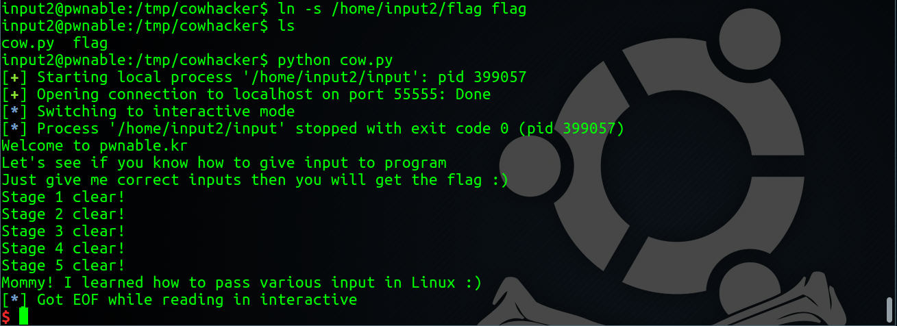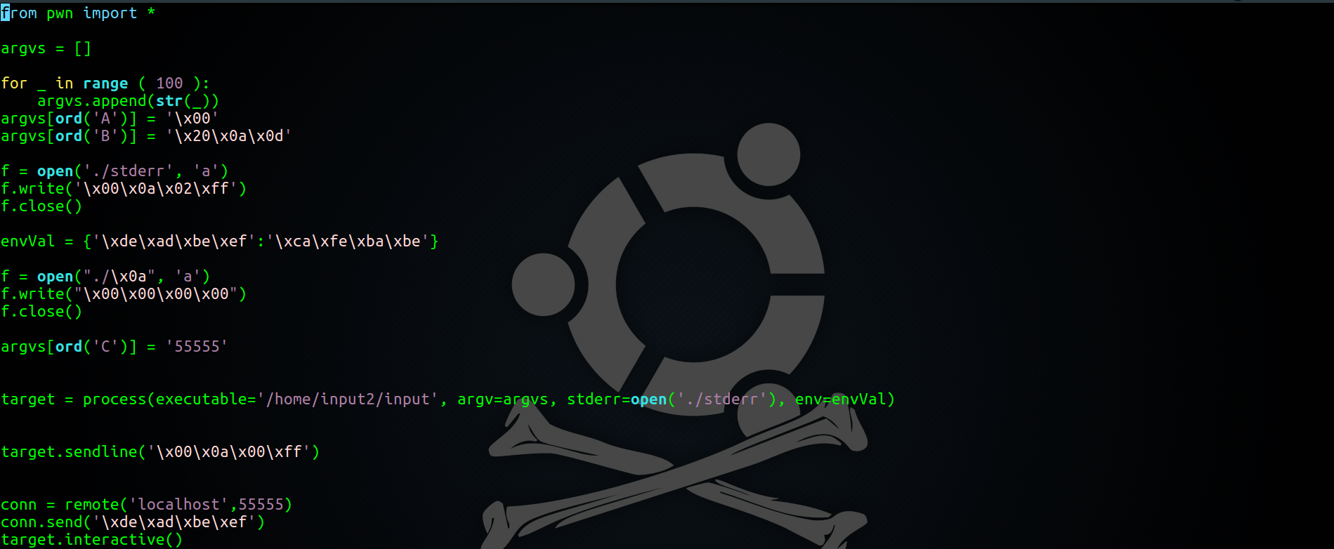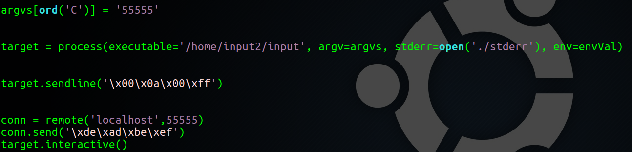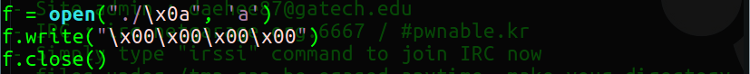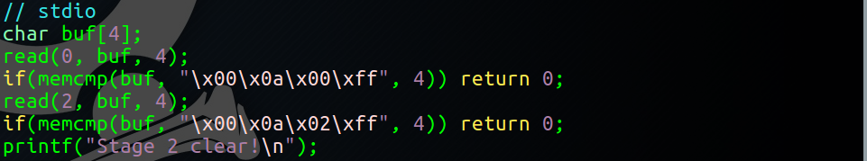 stdin에 \x00\x0a\x00\xff을 주고 sterr에 \x00\x0a\x02\xff을 줘야 된다는 걸 알 수 있다.
