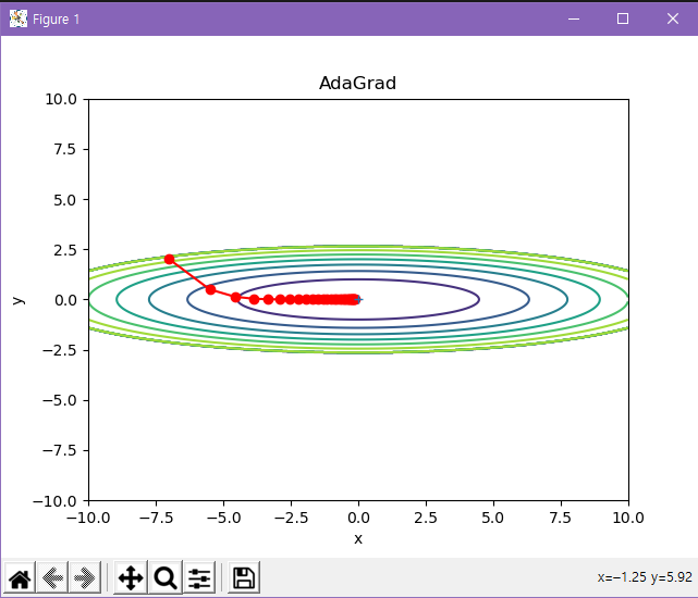 y축 방향은 기울기가 커서 처음에는 크게 움직이지만, 그 큰 움직임에 비례해서 갱신 정도도 큰 폭으로 작아지도록 조정된 걸 볼 수 있다.