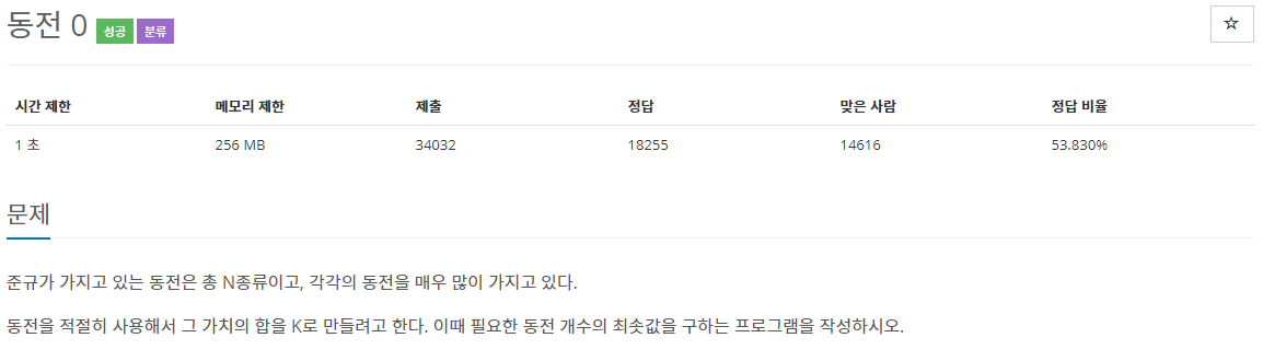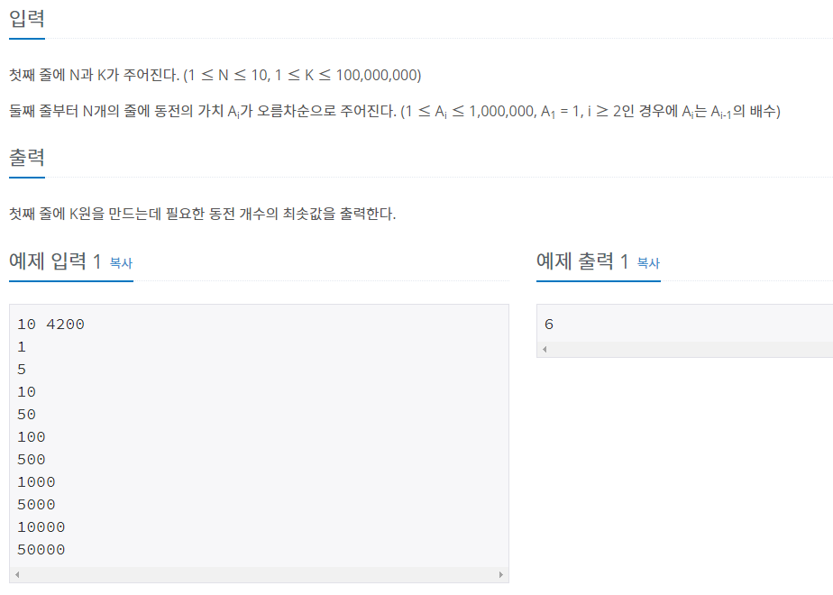 coins, price = map(int,input().split()) # 동전 종류 수와 가격을 띄어쓰기 기준으로 각각 입력 받는다.