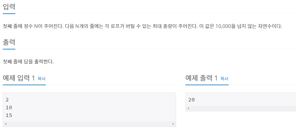lopelist = sorted(lopelist) # 로프 종류 리스트를 오름차순으로 정렬한다.
