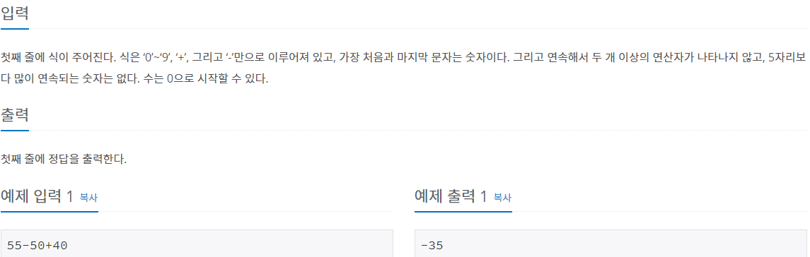 내가 이 문제를 풀 때 + 와 - 기준으로 끊어 입력을 받는 것을 구현하기 익숙하지 않았다.
