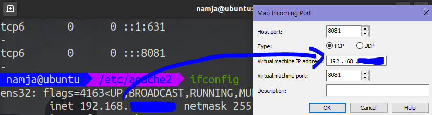 Virtual machine IP ~ 설정에서는 자신의 우분투 ip를 입력해준다.