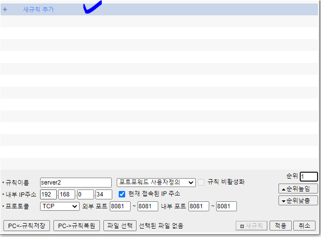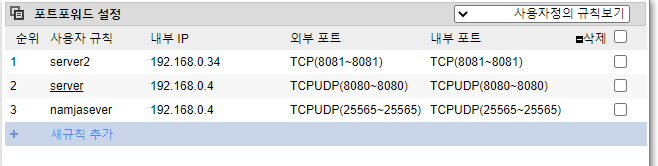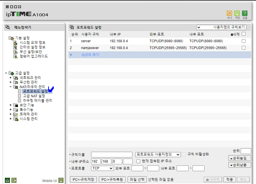 고급설정 > NAT/라우터 관리 > 포트 포워드 설정