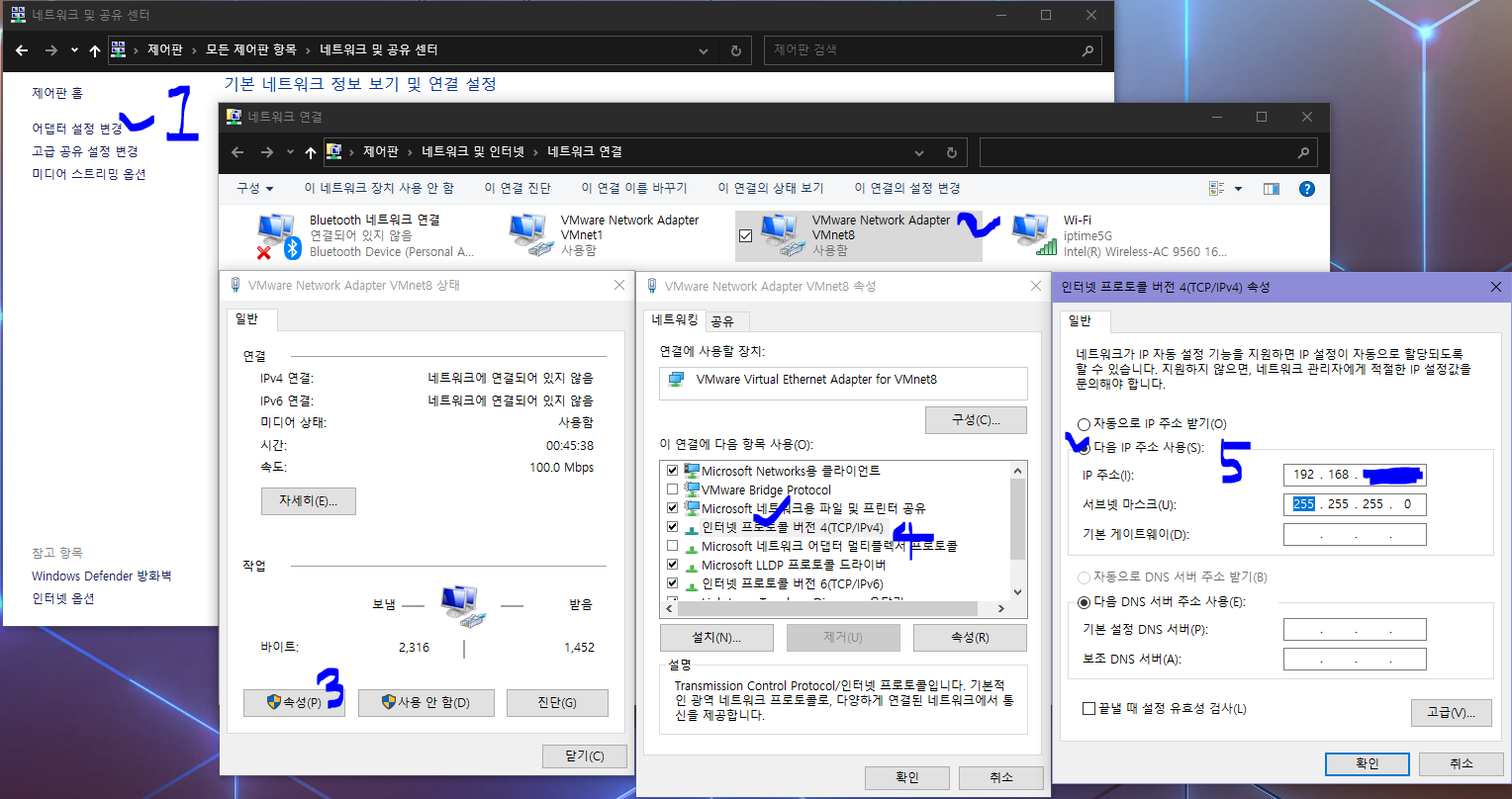 이제 VMware가 아닌 로컬 컴퓨터 제어판에 들어가 위 사진과 같이 접속을 한다.