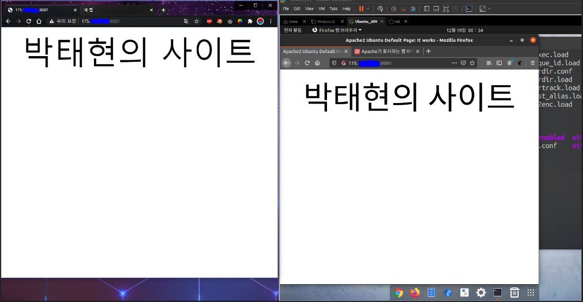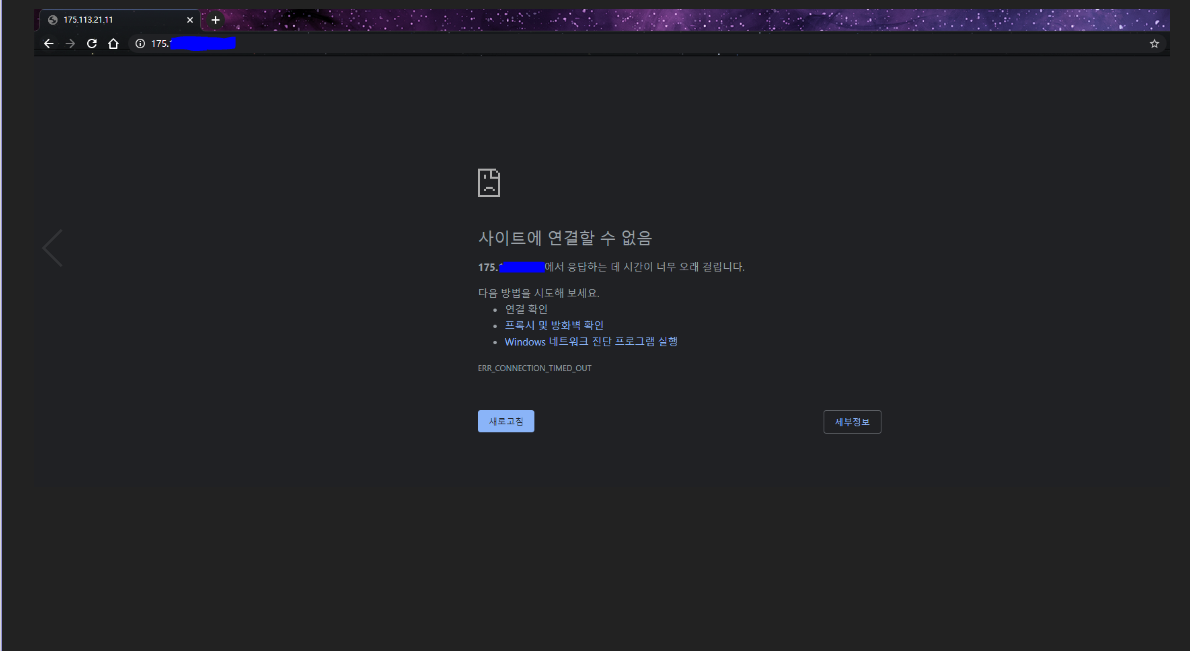 위 사진 처럼 지금 주소창에 자신의 공인 ip를 입력하면 아무 접속이 되지 않는다.