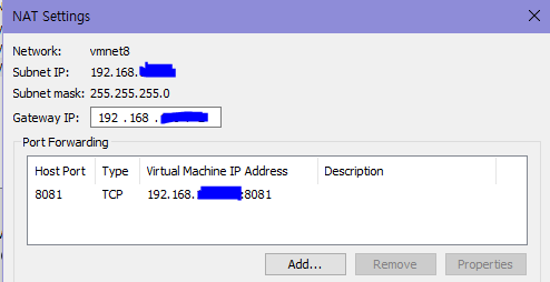 외부에서 로컬 컴퓨터로 접속 시 서버 (VMware)로 들어 가게 해주는 단계다.