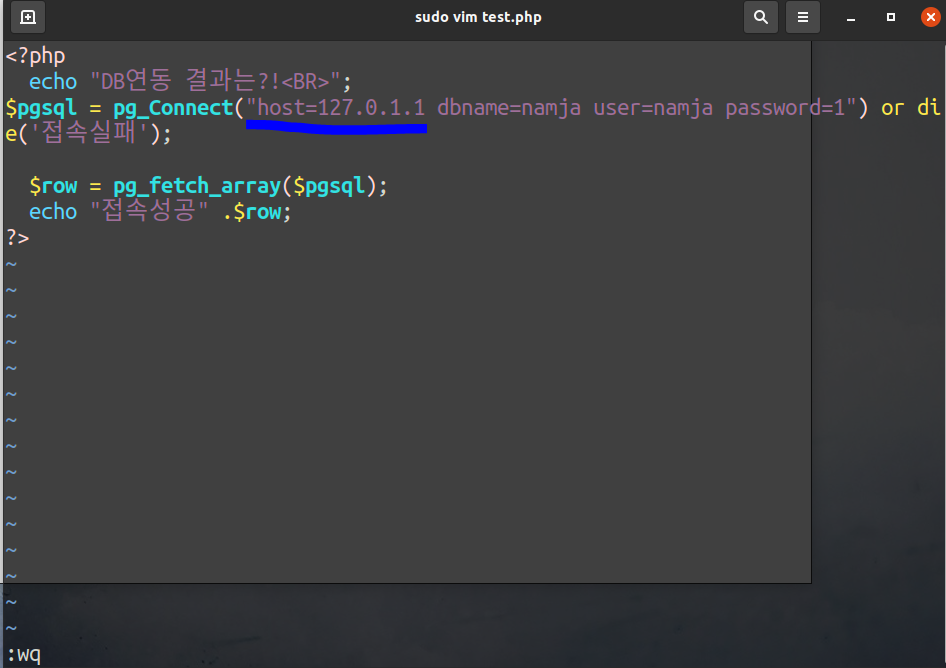 $pgsql = pg_Connect("host=127.0.0.1 dbname=namja user=namja password=1") or die('접속실패');