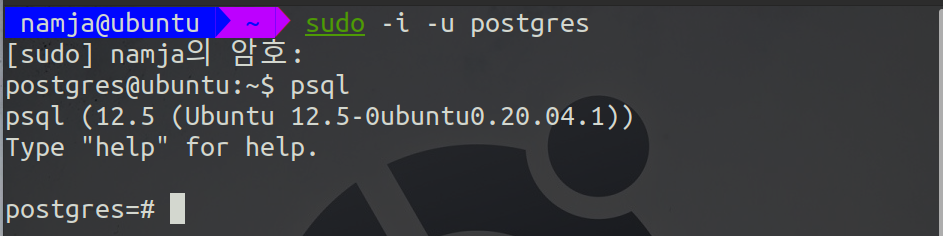 postgresql을 설치하면 자동으로 만들어지는 postgres 유저로 로그인한다.