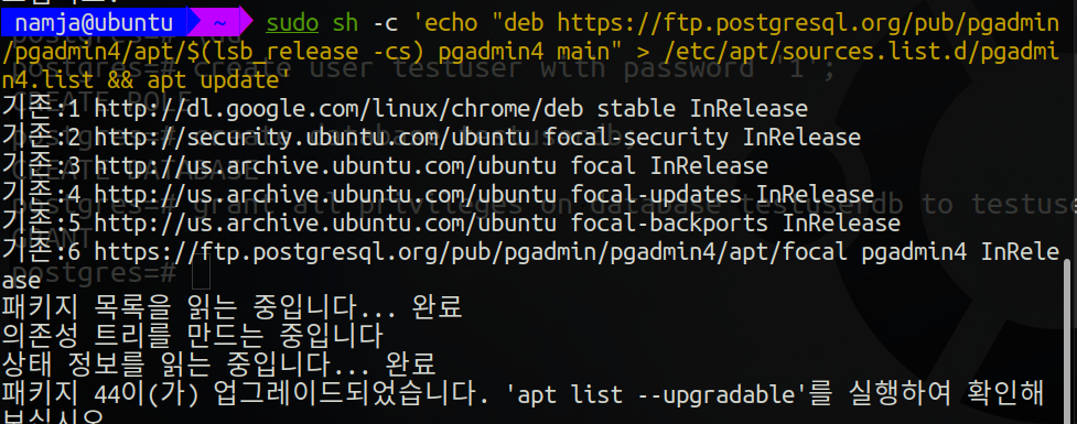 위 두 명령어를 통해 pgadmin4를 설치하기 전 준비 작업을 한다.